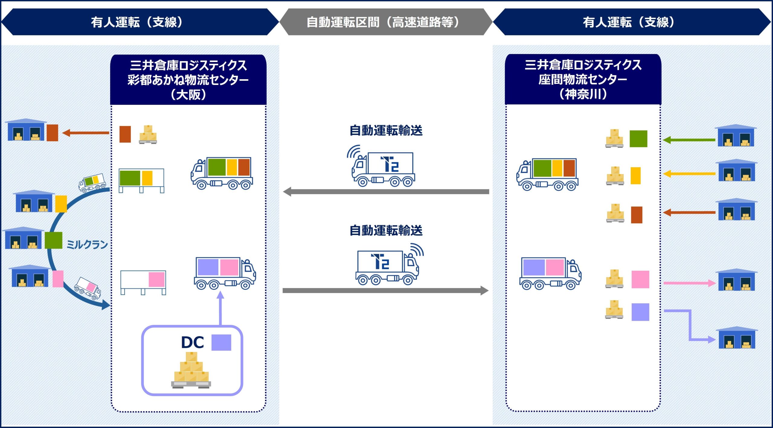 三井倉庫ロジの「座間物流センター」(神奈川県)と「彩都あかね物流センター」(大阪府)に、協力荷主企業のパナソニックグループ、ネイチャーラボ、ダイキン工業、ドトールコーヒー、エレコムの貨物を集める。T2のレベル2自動運転トラックに混載し、両拠点間を幹線輸送する。