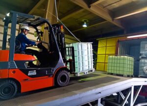 輸入した「アドブルー」をコンテナからフォークリフトで降ろす様子