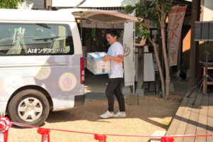 利用者の要求に応じて提供するオンデマンド方式で、電話やアプリから予約可能。車両の空きスペースや空き時間を活用してスーパーの総菜や日用品セット、カタログの商品を利用者の自宅まで届ける。