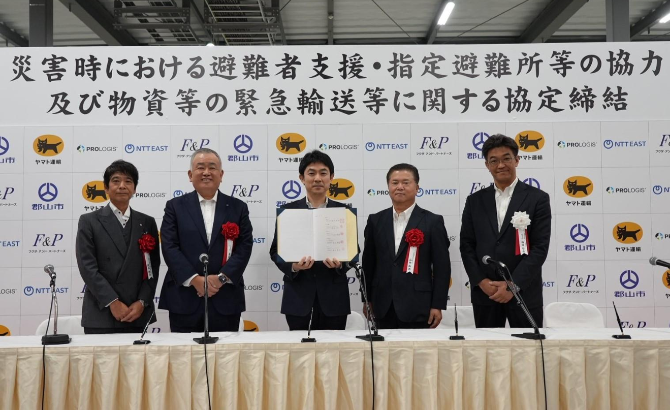 ヤマト運輸(本社・東京、阿波誠一社長)やプロロジス(同・同、山田御酒会長兼CEO)、フクダ・アンド・パートナーズ(同・同、福田哲也社長)は10月20日、福島県郡山市、NTT東日本福島支店と、災害支援に関する連携協定を締結した。発生時の一時集積所や、支援物資の配送、避難所の運営で協力する。