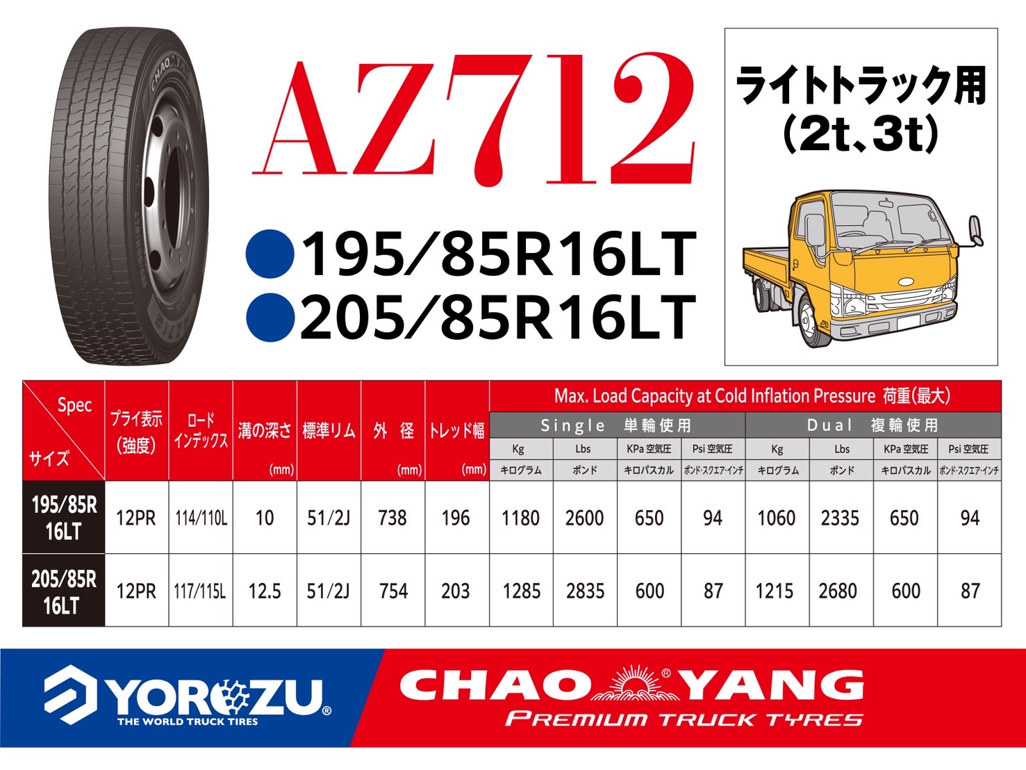 発売開始するタイヤは中国タイヤメーカーのZCラバー社が製造した「チャオヤン」ブランドの「AZ712」。トレッド幅などのサイズが異なる「195/85R16LT」と「205/85R16LT」を揃える。高飽和パターン設計により、耐摩耗性を大幅に向上させ、走行距離を伸ばした。ジグザグリブにより地域配送用途に優れたトラクション性能を持つ。専用トレッドコンパウンドを採用し、より長い耐摩耗寿命と使用寿命を実現した。