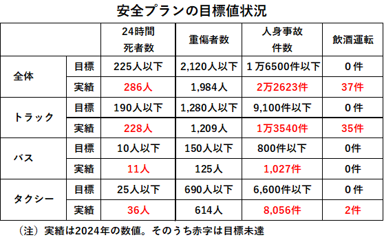 安全プランはトラック、バス、タクシーの安全対策で柱となる計画。2020年度にスタートした現在のプランのうち、トラックは死者数を190人以下、人身事故件数を9100件以下、飲酒運転による事故をゼロ件にするなどの目標値を掲げている。だが、24年の実績値で見ると、重傷者数(1209人)以外は目標達成が難しい状況にある。