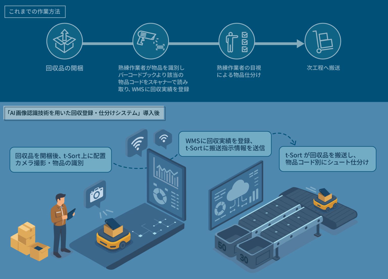 新システムは、返却されたレンタル通信機器を再利用するために洗浄や動作試験などを行うリファビッシュ業務に導入した。回収した機器背面にある物品名の文字情報や機器識別番号のバーコード情報をAI画像認識技術で自動判別してWMSに登録。WMSからAGVへ仕分け搬送の指示情報を送信し、自動仕分けを実施。1時間当たり約1300台の機器の自動登録・仕分けが可能で作業者1人当たりの処理台数を示す生産性が30%向上し、仕分けミス0%を達成。また熟練作業者に依存しない作業体制を確立した。