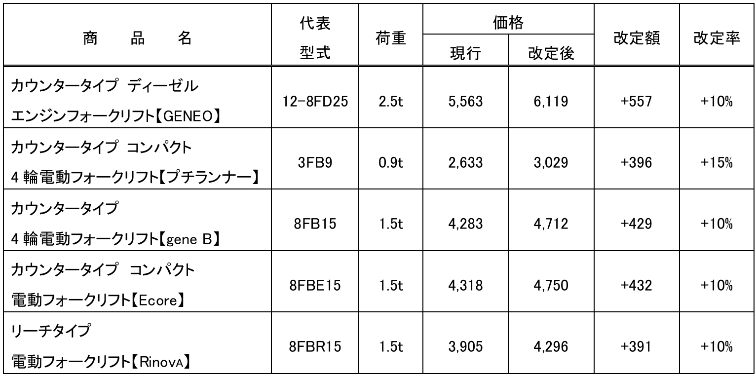 価格改定率は、フォークリフトが10~15%、ショベルローダー・搬送機器・けん引車などが5~20%。