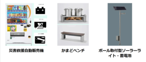 また、施設内の緑地スペースにかまどベンチ、ソーラーライト・蓄電池、災害救援自動販売機を設置し、「防災パーク」として地域に開放する。