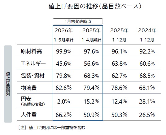 帝国データは、大規模な値上げラッシュとなった25年10月以降、飲食料品の値上げは一服感がみられるとする。足元では、原材料高による「モノ由来」の値上げと、人件費増によう「サービス由来」の値上げが高水準で推移している。インフレ懸念が続く中、「4月ごろまでは値上げは落ち着く見通し。ただ、急激な円安の進行が5月以降の飲食料品価格の上振れリスクとなる可能性がある」(帝国データ)。