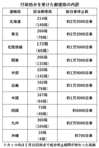 日本郵便が軽貨物車を運転するドライバーの点呼を不適切に行っていた問題で、国土交通省は2月10日、違反を確認した全国の郵便局に対する行政処分の通知を終えた。車両の使用停止を科された郵便局は計1862局だった。6月初旬には全ての軽貨物車が使用できる見通しで、過去最大の処分はひとまず幕を下ろす。
