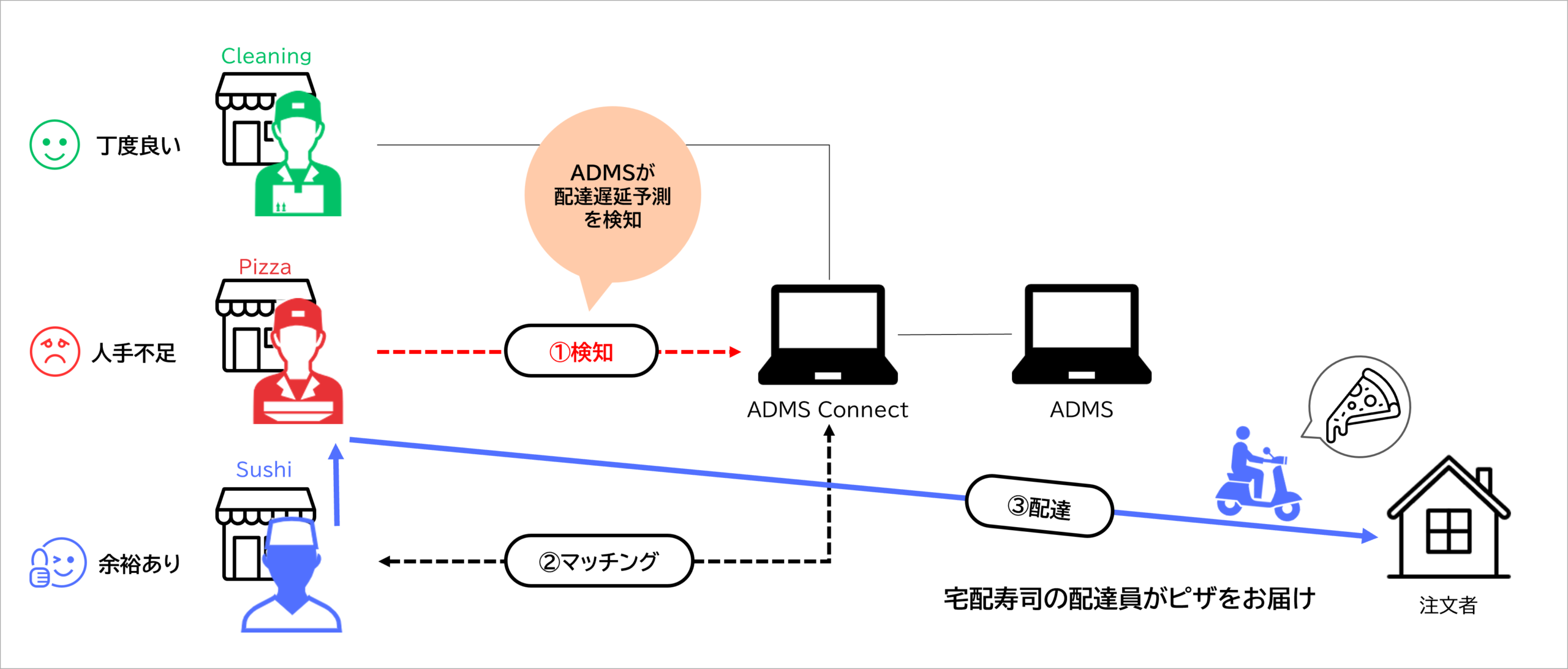 特許技術は、配送DXシステム「アダムス」と共同配送プラットフォーム(基盤)「アダムス コネクト」を活用。人手不足の店舗での配達遅延をアダムスが予測した場合、近隣店舗で次の配達予定がなく余裕のあるスタッフを自動で特定し、該当スタッフへ配達指示を送信。人手不足の店舗の顧客への配送を代わりに完了させる。宅配ピザや寿司など各店舗が抱える配送リソースを地域全体で活用できるようにする。
